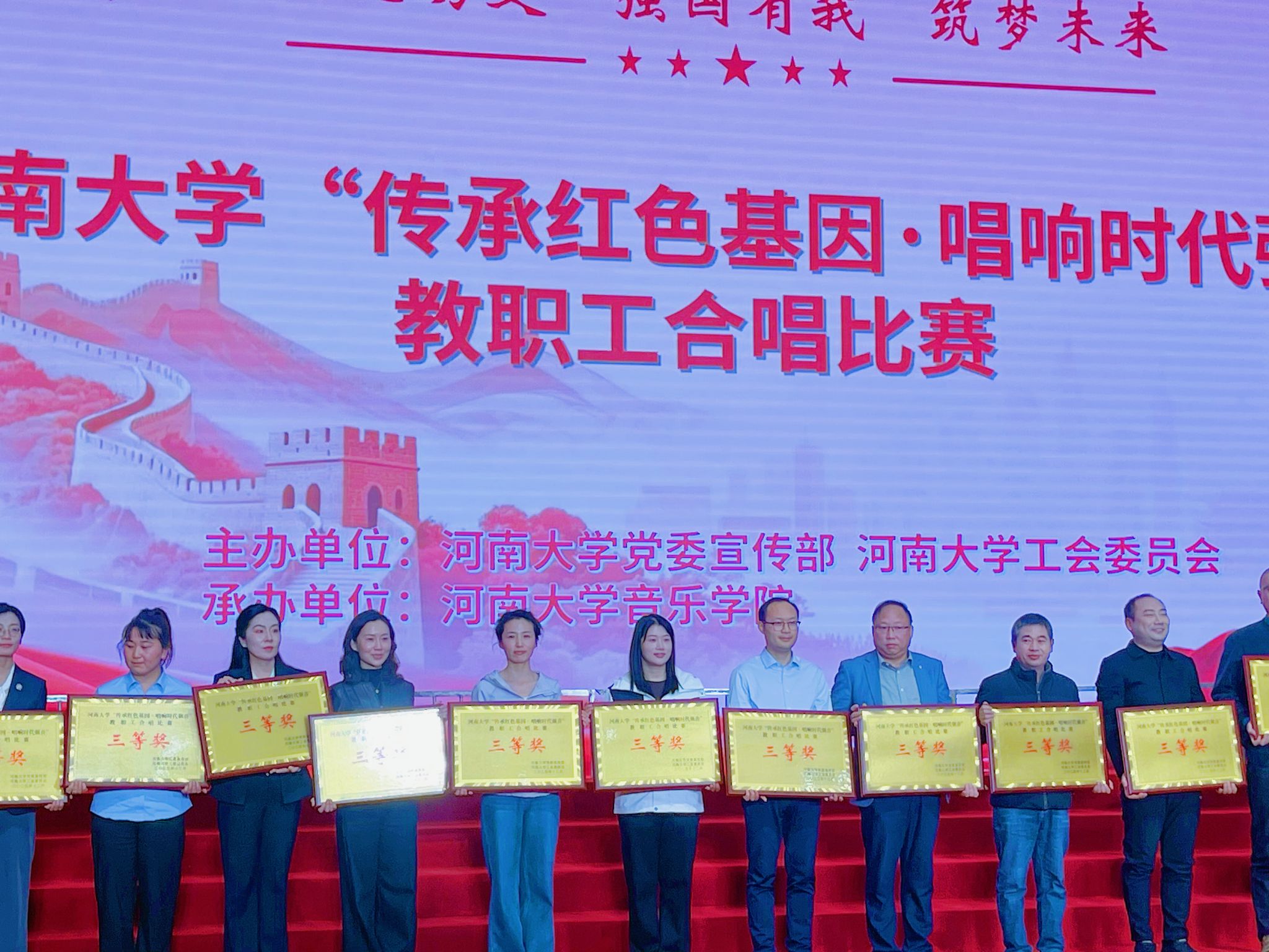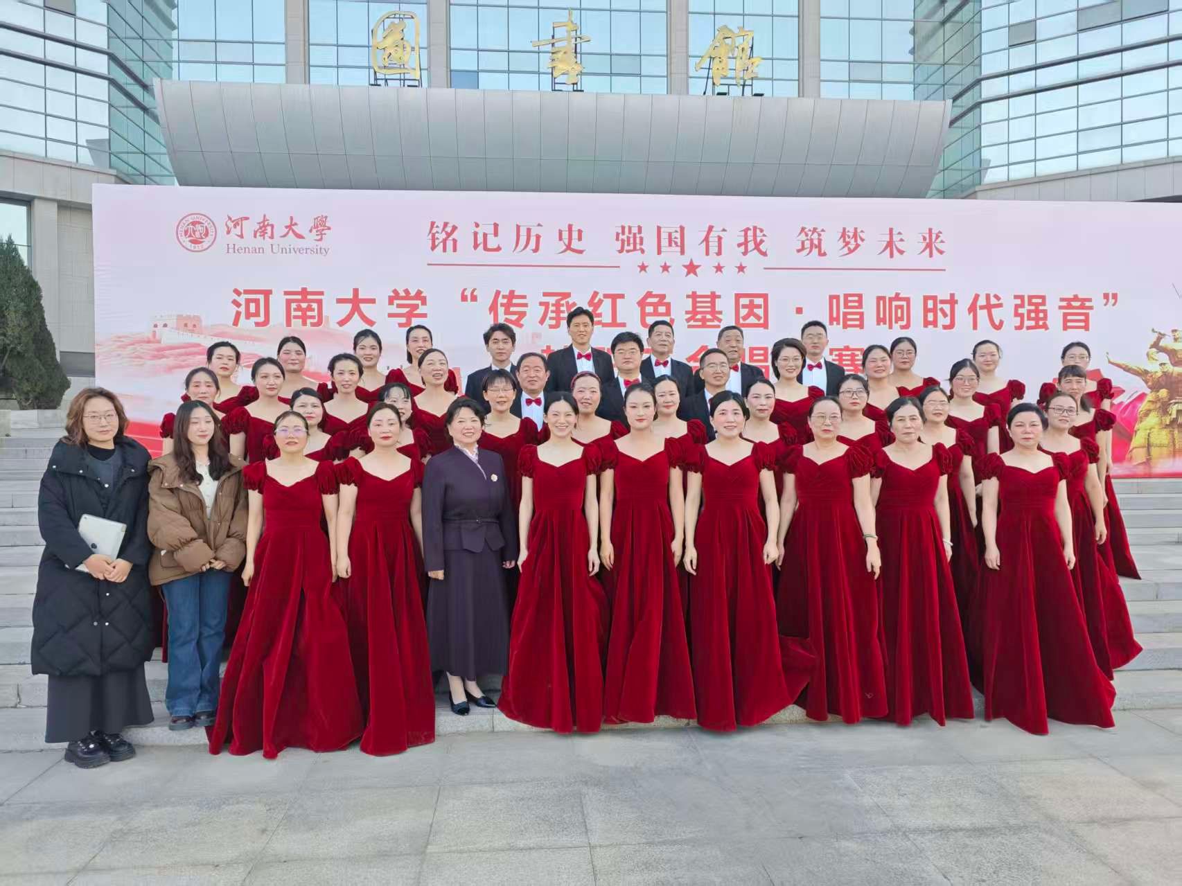 2025年12月6日,河南大学“传承红色基因·唱响时代强音”教职工合唱比赛在金明校区图书馆一楼报告厅成功举办。经过45支参赛队伍的激烈角逐,基础医学院教师合唱队以一曲深情激昂的《天耀中华》脱颖而出,荣获大赛三等奖。