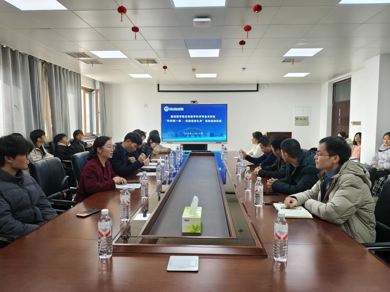 为推动学院生物医学科学专业本科生双导师制顺利推进,培养本科生初步科研意识和素养,12月10日上午,基础医学院“科研第一课——实验室巡礼月”活动启动仪式在五楼会议室举行。学院党委副书记郭佳、副院长王耀辉、学院五个科研平台主任和联络员出席活动,生物医学科学办公室成员及2025级生物医学科学专业全体本科生共同参与。启动仪式由生物医学科学办公室主任王艳鸽主持。