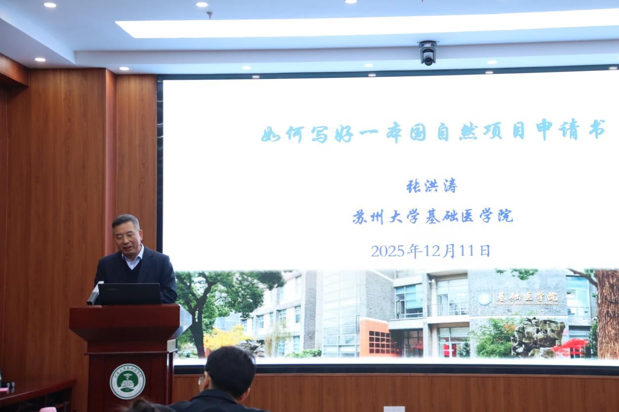 接着,苏州大学张洪涛教授作《如何撰写高质量国家自然科学基金项目申请书》专题报告,按照基金申请书撰写提纲逐条解析,为师生呈现了清晰、务实、可操作的基金写作方法与思维框架。