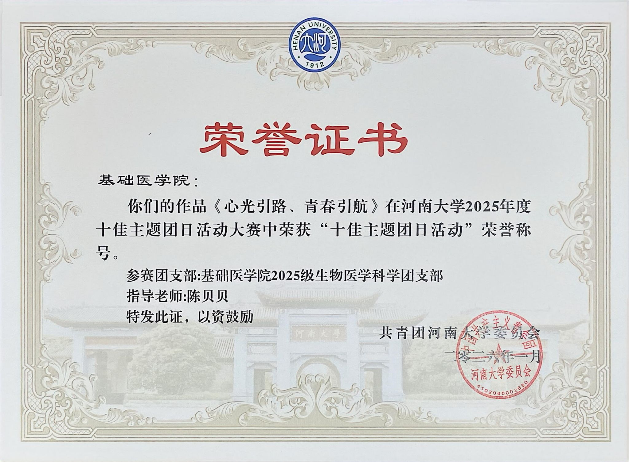 近日,河南大学2025年度“十佳团日”评选结果揭晓。经学院推荐与学校评审,基础医学院生物医学科学团支部开展的“心光引路 青春引航”心理健康主题团日活动,从全校46项参评主题团日中脱颖而出,获评校级“十佳团日”称号。
