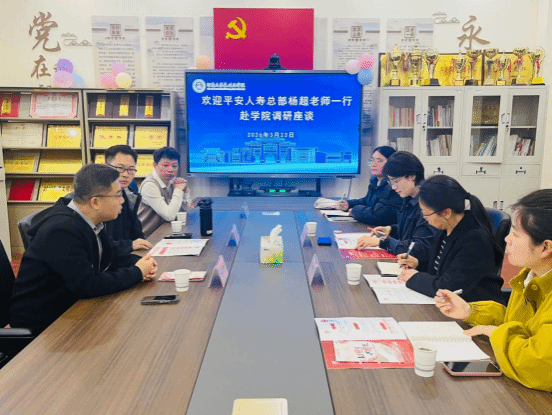 3月23日,平安人寿总部杨超等一行赴学院开展调研座谈,学院党委副书记郭佳、医学院学生科科长尚艳青、学院研究生辅导员李双洁、团委负责人李晓静参会,会议由郭佳主持。