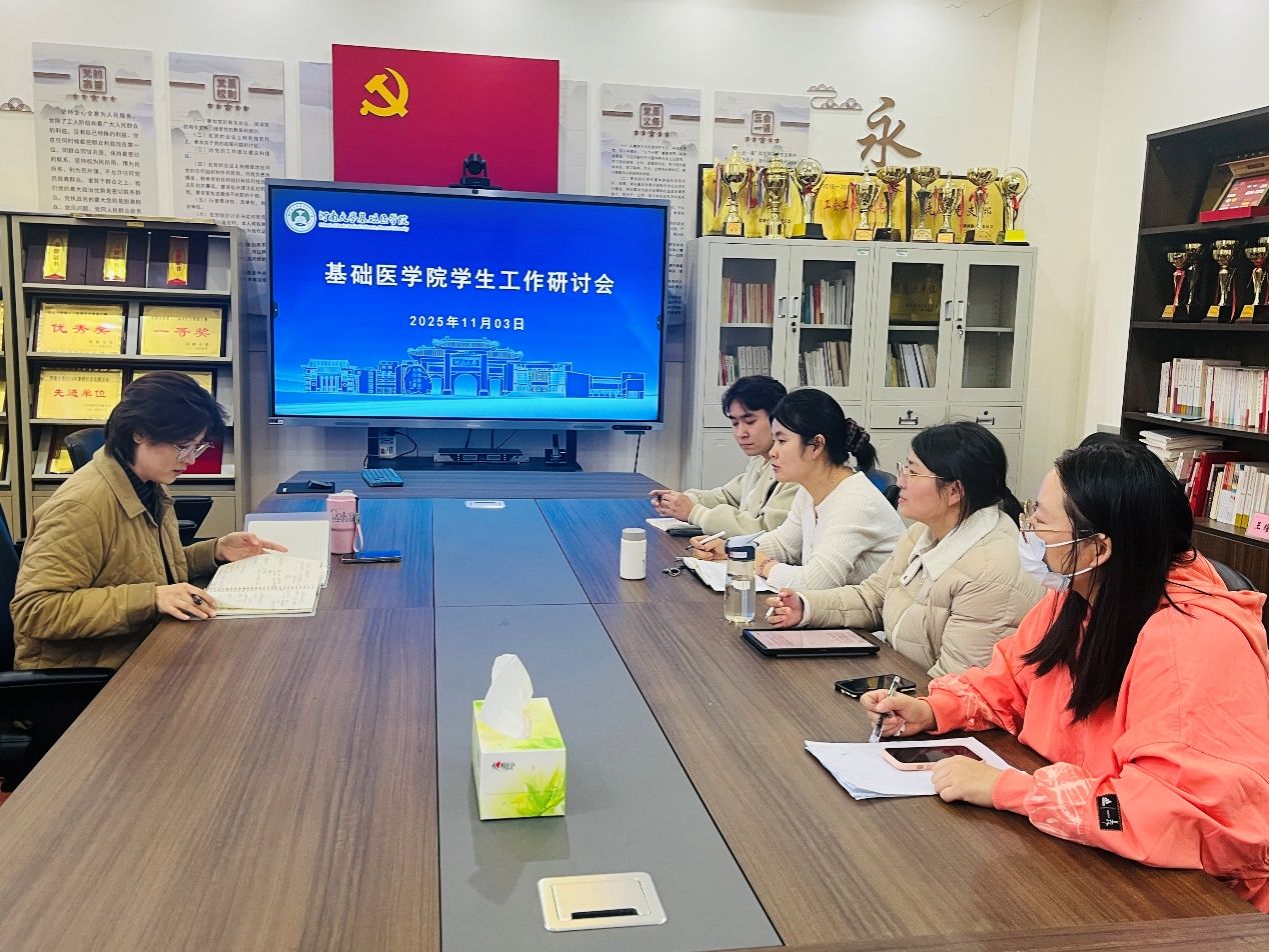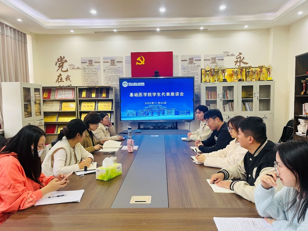 2025年11月3日,在基础医学院一楼党建活动室召开研究生代表座谈会及本周学生工作会议。学院党委副书记郭佳、团委负责人李晓静、研究生辅导员刘静、本科生辅导员陈贝贝参会,与学生代表深入交流学情动态以及系统部署下一阶段学生工作重点。