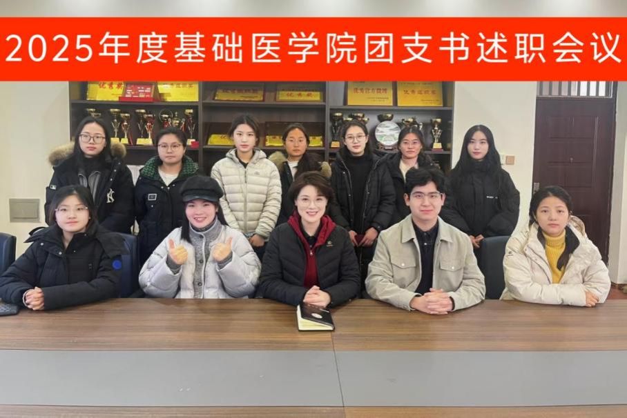 为进一步加强团干部队伍建设,提升学院共青团工作实效,2026年1月20日上午,基础医学院在学院一楼党建办公室召开2025年度团支书述职评议会议。会议由团委负责人李晓静主持,学院党委副书记郭佳及全院各级团支书共同参加。