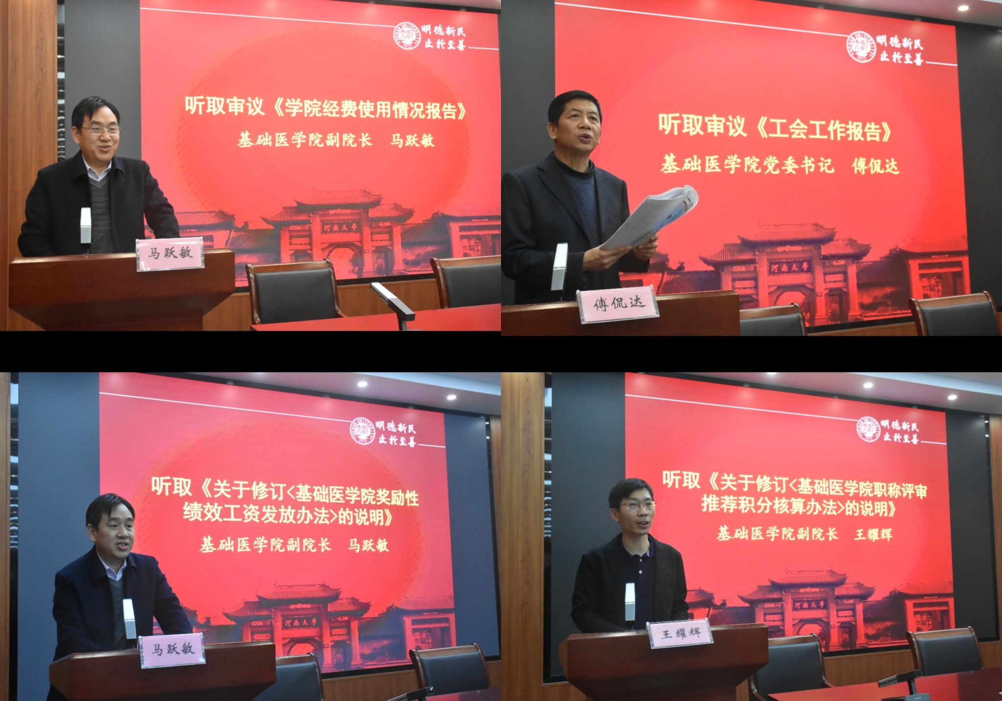 会议期间,全体代表认真听取并审议了由院长李继承所作题为《凝心聚力 创新发展 加快构建一流学院一流学科建设新格局》的学院工作报告。报告全面回顾了学院过去一段时间在学科建设、人才培养、科学研究、社会服务等方面取得的主要成就,系统分析了当前面临的机遇与挑战,并对未来一段时期的发展目标与重点工作进行了规划和部署。代表们一致认为,报告内容全面、重点突出,目标明确、措施有力,为学院事业持续健康发展指明了方向。会议还审议了由副院长马跃敏所作的《学院经费使用情况报告》,听取了由傅侃达所作的题为《凝心聚力促发展 服务职工谱新篇》的工会工作报告。此外,大会听取了关于修订《基础医学院奖励性绩效工资发放办法》和《基础医学院职称评审推荐积分核算办法》的专项说明。