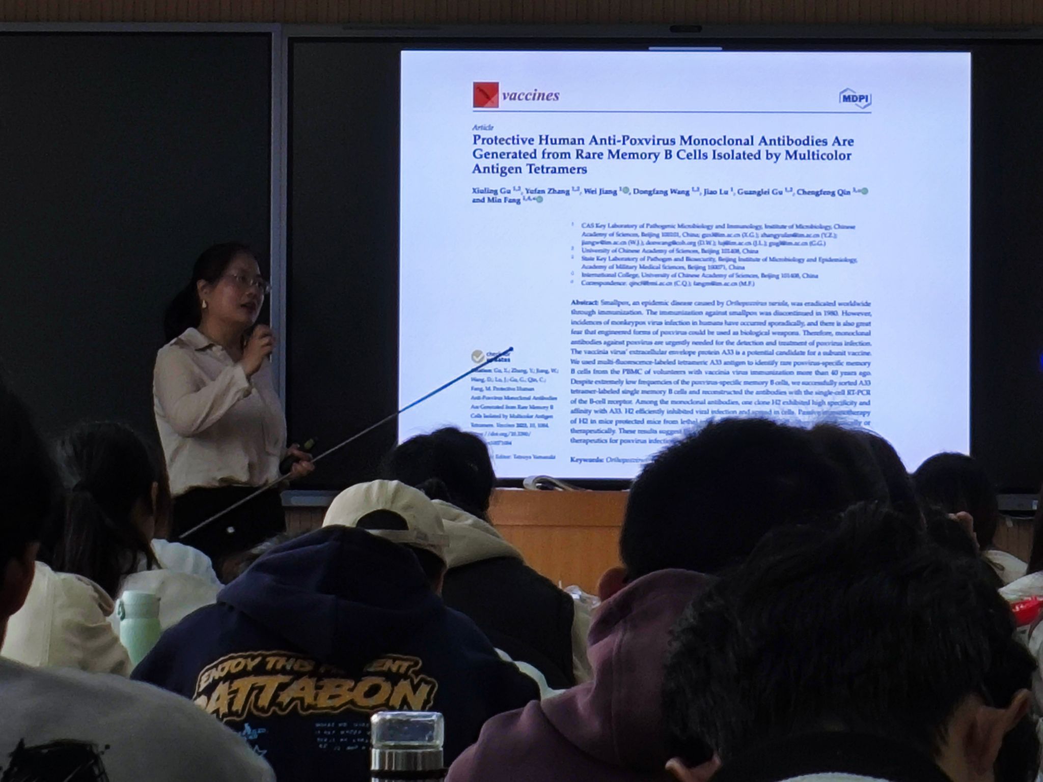 抗体是体液免疫应答的“明星分子”,也是连接基础免疫学与临床转化的重要桥梁。方教授以自己团队发表于《Vaccines》期刊的研究为例,向同学们展示了如何利用多色荧光标记的抗原四聚体技术,从40多年前接种过天花疫苗的志愿者体内,如同大海捞针一般,分选出针对痘苗病毒A33抗原的特异性记忆B细胞,进而通过单细胞RT-PCR等分子生物学技术,成功获得了具有高中和活性的全人源单克隆抗体H2。方教授生动地讲述了该抗体如何在细胞水平有效抑制病毒感染和扩散,并在动物模型中保护小鼠免受致死性攻击。她借此深入浅出地解析了B细胞应答在疫苗研发与抗感染免疫中的关键作用,并鼓励同学们:“从基础理论到抗体药物的诞生,每一步都离不开对免疫学规律的深刻洞察与技术创新。”