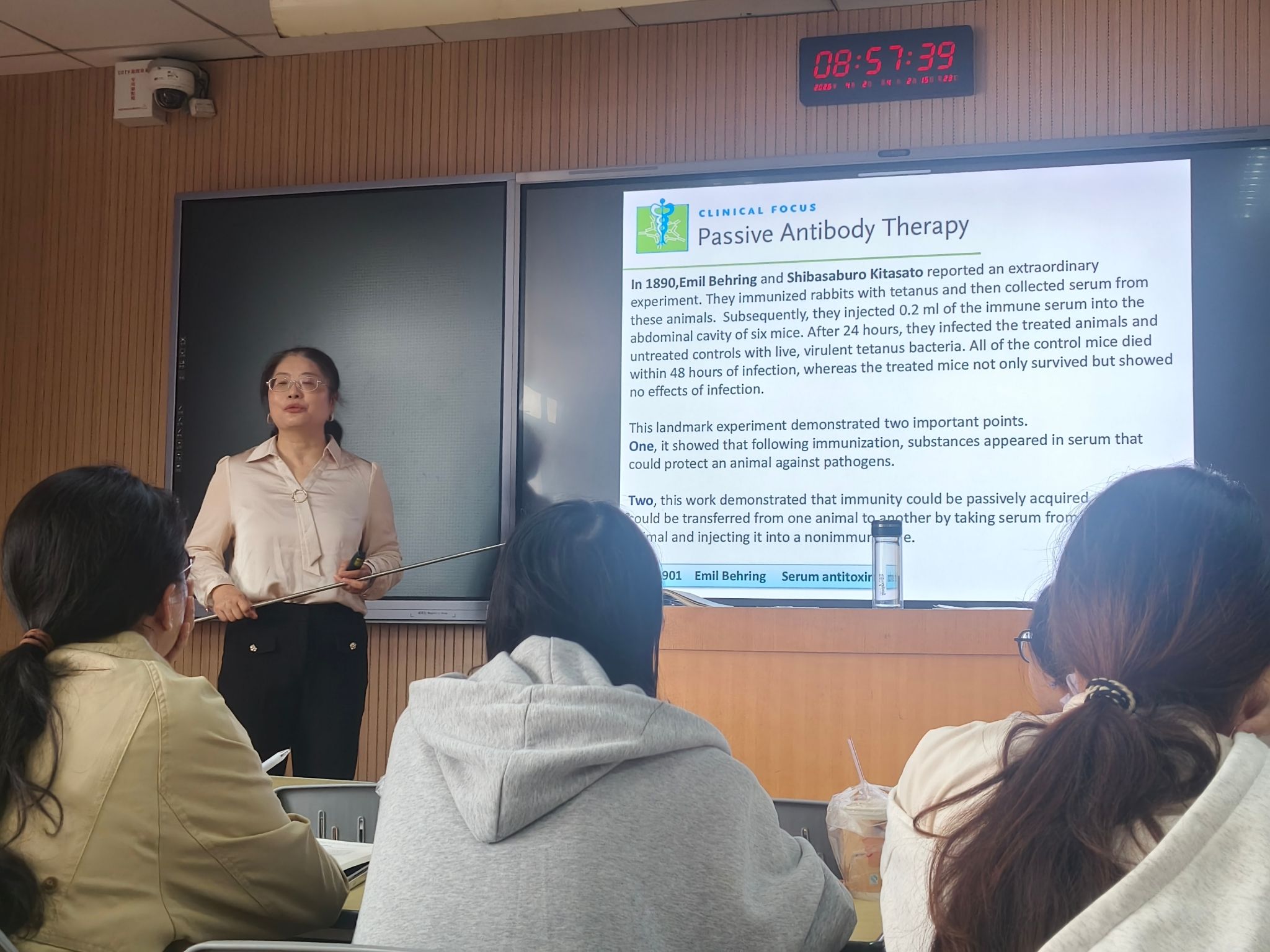 课堂上,方敏老师不时向学生抛出问题启发思考,引导学生从“知识点”走向“问题源”。同学们反响热烈,纷纷表示,这种“基础理论+科研思维”的双师模式,不仅让抽象的免疫学原理“活”了起来,更点燃了自己探索科学前沿的热情。